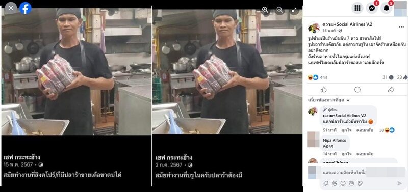 ขณะเดียวกัน เฟซบุ๊กเพจ "ควาย+Social Airlines V.2" ยังได้นำภาพที่เชฟกระทะฮ้างโพสต์ไว้มาเปรียบเทียบ เป็นภาพที่เชฟกระทะฮ้างถือแพ็กน้ำปลาร้า โพสต์ไว้เมื่อวันที่ 15 พ.ค.2567 เขียนแคปชั่นว่า "สมัยทำงานที่สิงคโปร์ก็มีปลาร้าขายเด้อขาดบ่ได้" ส่วนอีกโพสต์นึงเป็นภาพเดียวกัน โพสต์ไว้เมื่อวันที่ 2 ก.ค.2567 เขียนแคปชั่นว่า "สมัยทำงานที่บรูไนครับปลาร้าต้องมี"