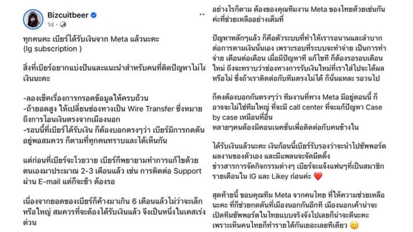สุดท้ายนี้ ขอบคุณทีม Meta จากคนไทย ที่ให้ความช่วยเหลือนะคะ ที่ก็ช่วยกดดันที่เมืองนอกกันอีกที เมืองนอกเค้าน่าจะเปิดทีมซัพพอร์ตในไทยแบบจริงจังไปเลยก็น่าจะดีนะคะ เพราะเห็นคนไทยก็ทำรายได้กันเยอะเลยทีเดียว”