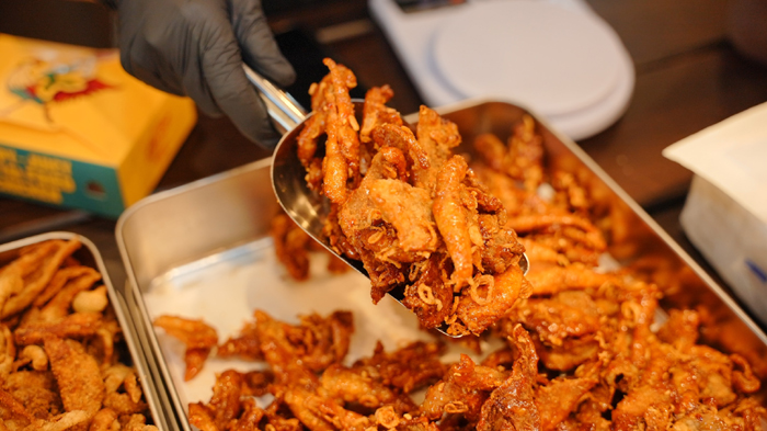 อีกหนึ่งเมนูดาวรุ่งที่ฮาโร่ยภูมิใจนำเสนอ คือ “หนังไก่ทอดหาดใหญ่” แบบพรีเมียม ซึ่งผ่านกรรมวิธีพิถีพิถัน ทั้งขูด ไขมัน ต้ม อบ และทอด เพื่อให้ได้ Texture หนังไก่ที่กรอบพองตัวตามธรรมชาติ ใช้แป้งเพียง 7–8% เท่านั้น เมื่อเทียบกับสินค้าทั่วไปในตลาดที่มีแป้งมากกว่าครึ่ง ทำให้สัมผัสที่ได้เต็มไปด้วยความกรอบ ไม่อมน้ำมัน ส่วนรสชาติ ก็ถือว่าเป็นที่สุดของความ “ใต้แท้” เพราะใส่สมุนไพรอย่างกระเทียม รากผักชี พริกไทยขาว และหอมเจียวหอมกรุ่นหมักลงไปทุกแผ่น มีสองรสชาติหลัก ได้แก่ ออริจินอลที่กลมกล่อมเข้าถึงง่าย และรสน้ำจิ้มไก่ทอดที่เผ็ดเปรี้ยวหวานในคำเดียว กินเพลินได้ไม่มีเบื่อ