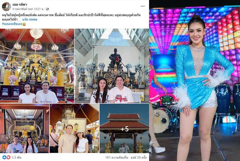 ขณะที่ เมื่อไม่กี่วัน เอม รมิดา ลูกทุ่งสาว ก็โพสต์ภาพไปทำบุญไหว้พระกับ แจ๊ค ในที่ต่างๆ หลายแห่ง พร้อมข้อความด้วยว่า