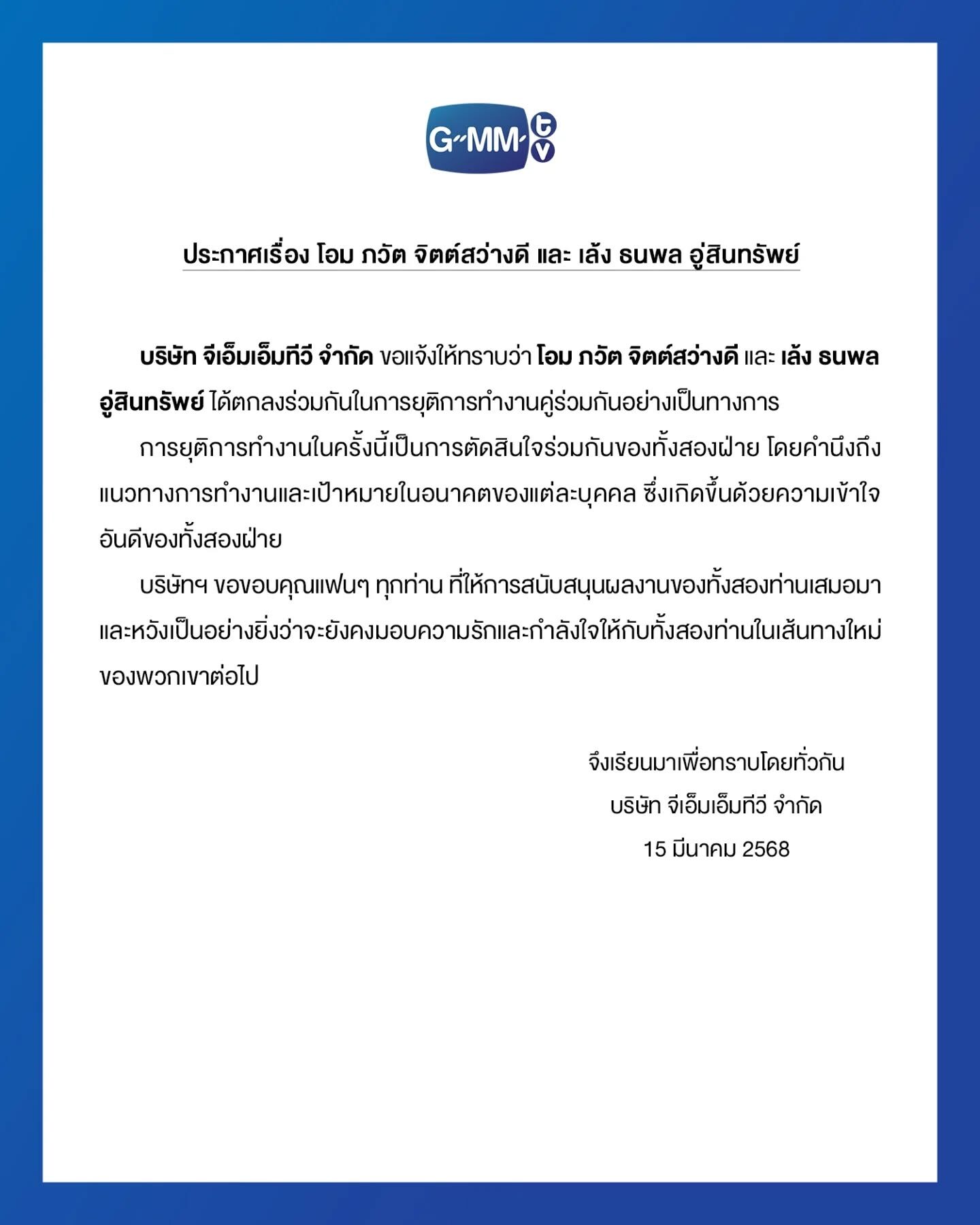 โดยระบุว่า บริษัท จีเอ็มเอ็มทีวี จำกัด ขอแจ้งให้ทราบว่า โอม กวัต จิตต์สว่างดี และ เล้ง ธนพล อู่สินทรัพย์ ได้ตกลงร่วมกันในการยุติการทำงานคู่ร่วมกันอย่างเป็นทางการ
