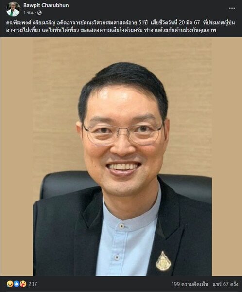 เปิดสาเหตุ พีระพงศ์ ตริยเจริญ อดีตผู้จัดการระบบ TCAS เสียชีวิตแล้ว ระหว่างเดินทางไปเที่ยวต่างประเทศ