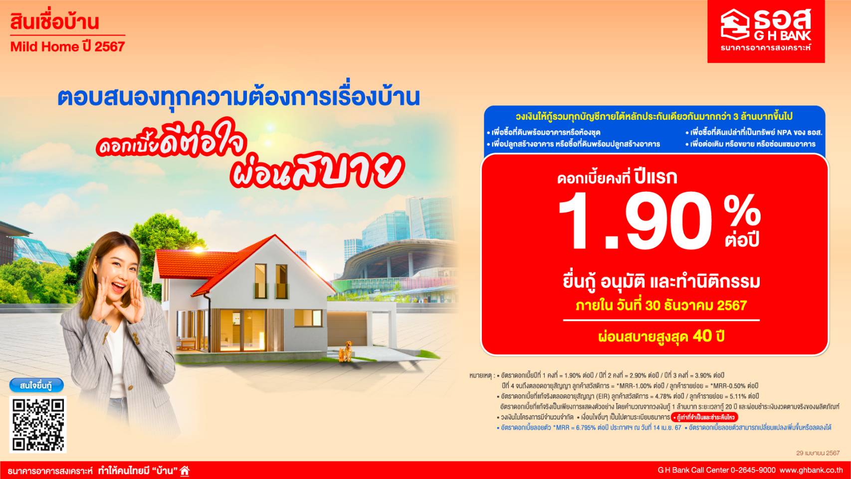 ธอส. จัดทำสินเชื่อ Mild Home ปี 2567 กรอบวงเงิน 10,000 ล้านบาท สำหรับที่อยู่อาศัยในระดับราคามากกว่า 3 ล้านบาทขึ้นไป อัตราดอกเบี้ยปีแรก 1.90% เฉลี่ย 3 ปีแรก 2.90% ระยะเวลากู้นานสูงสุด 40 ปี เงินงวดปีแรกเพียงล้านละ 2,500 บาท เริ่มวันนี้