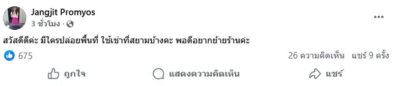 ล่าสุด แจง เมียแจ๊สออกมาโพสต์ข้อความประกาศหาเช่าที่ของร้านใหม่ และเตรียมย้ายร้านแล้วว่า “สวัสดีดีค่ะ มีใครปล่อยพื้นที่ ใช้เช่าที่สยามบ้างคะ พอดีอยากย้ายร้านค่ะ”