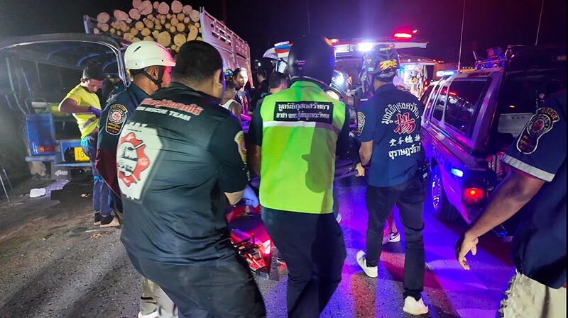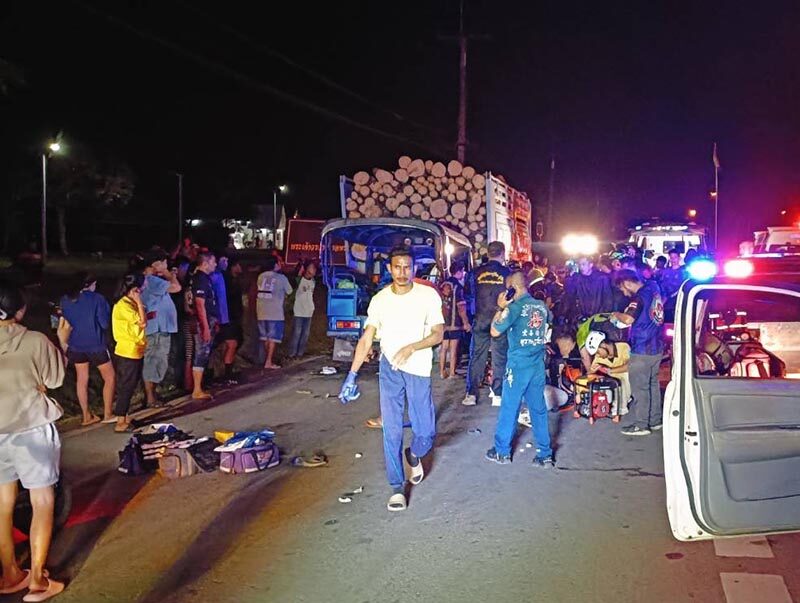 สลด! บังเซน ไมค์ทองคำ ขับตุ๊กตุ๊กชนรถบรรทุกไม้ยางจอดริมถนน ดับคาที่ ผู้โดยสารเจ็บ 7 ในจำนวนนี้สาหัส 6 มีทั้งผู้ใหญ่และเด็ก