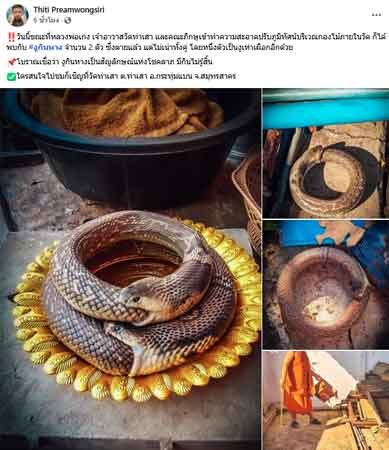 โดยหนึ่งตัวเป็นงูเห่าเผือกอีกด้วย โบราณเชื่อว่า งูกินหางเป็นสัญลักษณ์แห่งโชคลาภ มีกินไม่รู้สิ้น ใครสนใจไปชมก็เชิญที่วัดท่าเสา ต.ท่าเสา อ.กระทุ่มแบน จ.สมุทรสาคร" โดยหลังจากที่โพสต์ดังกล่าวถูกเผยแพร่ มีผู้คนจำนวนมากเข้ามาแชร์ต่อ