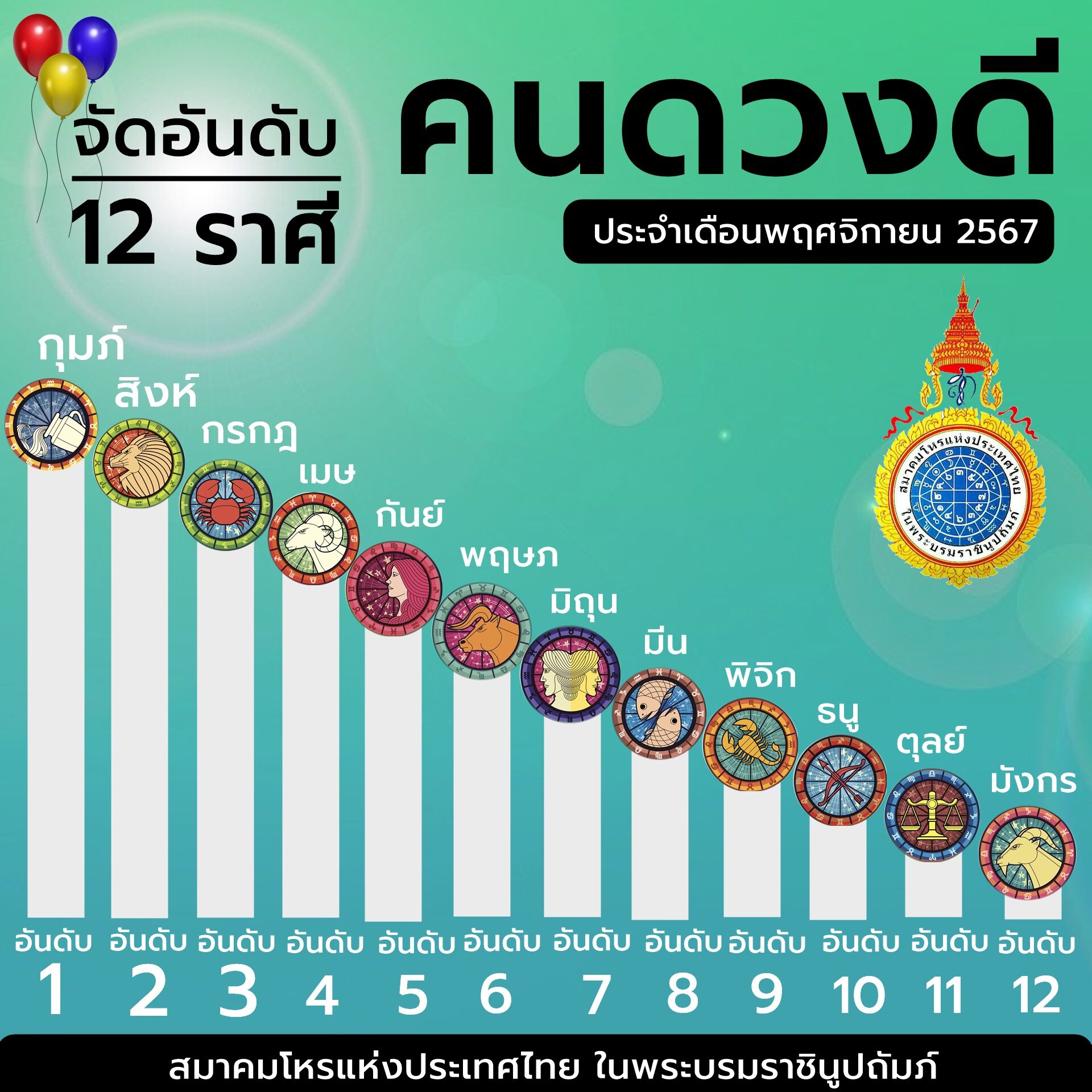 สมาคมโหรแห่งประเทศไทย ในพระบรมราชินูปถัมภ์ เปิดอันดับ คนดวงดีทั้ง 12 ราศี ประจำเดือนพฤศจิกายน เช็กเลยราศีใดสำเร็จยืนหนึ่ง