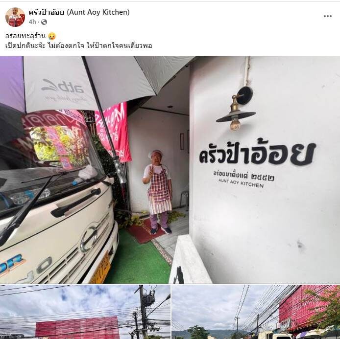 เพจ ครัวป้าอ้อย (Aunt Aoy Kitchen) ร้านอาหารชื่อดัง ใน จ.เชียงใหม่ เจ้าของรางวัล Michelin Guide 2023 โพสต์ภาพพร้อมข้อความ ระบุว่า อร่อยทะลุร้าน เปิดปกตินะจ๊ะ ไม่ต้องตกใจ ให้ป้าตกใจคนเดียวพอ หลังมีรถหกล้อพุ่งเข้าชนร้าน