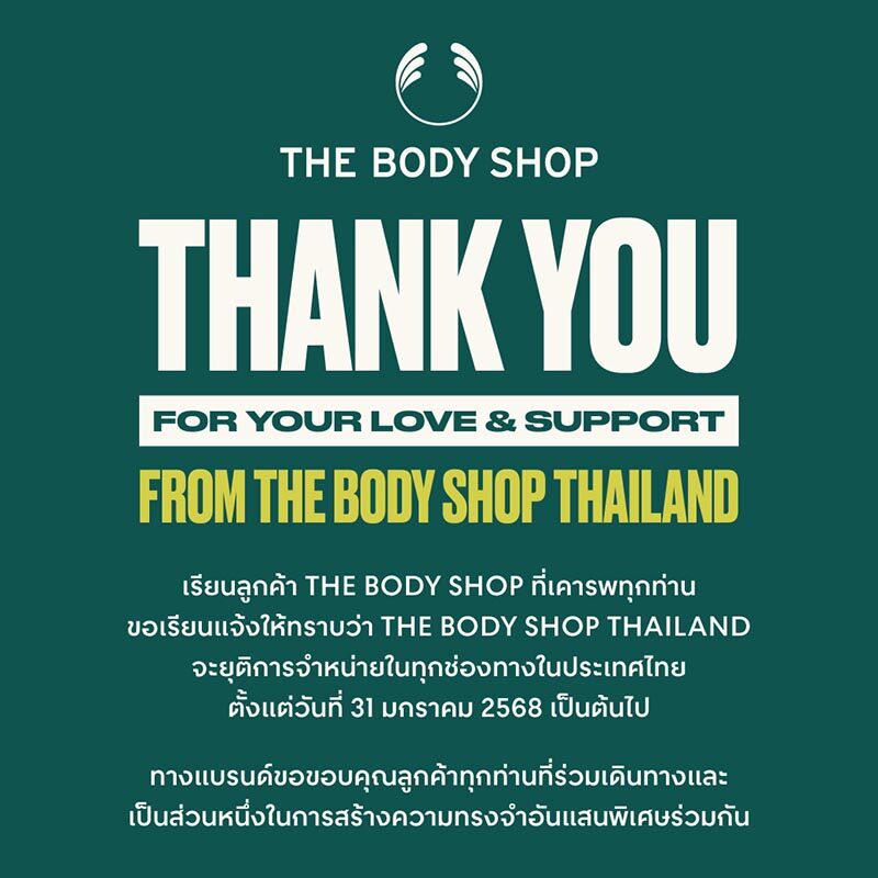 วันที่ 15 ม.ค. 2568 เพจ The Body Shop ซึ่งเป็นแบรนด์เครื่องสำอางชื่อดังระดับโลก สัญชาติอังกฤษ ออกประกาศปิดให้บริการทุกสาขา และยุติการจำหน่ายทุกช่องทางในประเทศไทย ระบุว่า – ! สวัสดีค่ะ ครอบครัว The Body Shop Thailand