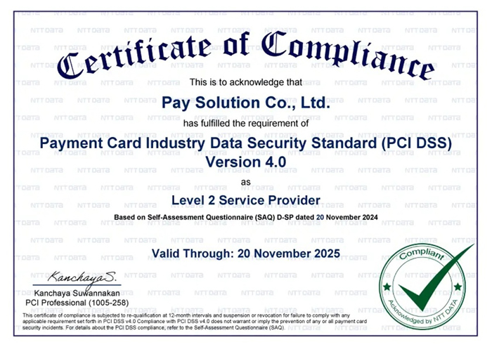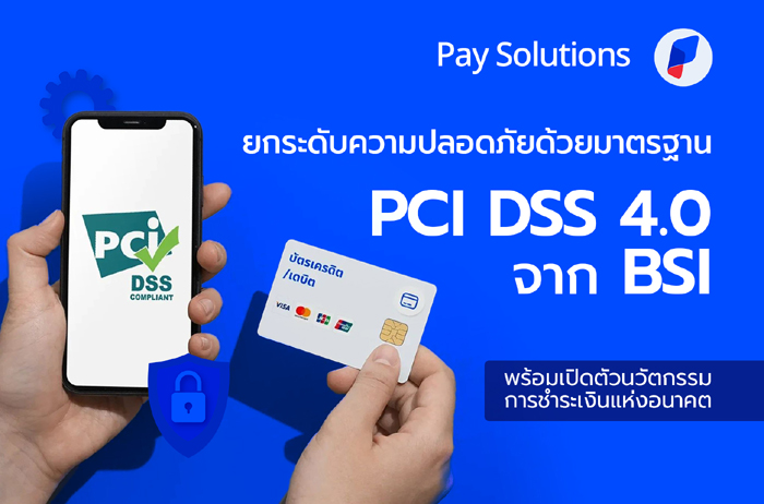 บริษัท เพย์โซลูชั่น จำกัด ผู้ให้บริการระบบชำระเงินออนไลน์แห่งแรกของไทย หรือ Pay Solutions ประกาศความสำเร็จครั้งสำคัญในฐานะหนึ่งในผู้ให้บริการไม่กี่รายในประเทศไทย ที่ผ่านการรับรองมาตรฐานความปลอดภัย PCI DSS (Payment Card Industry Data Security Standard) Version 4.0 จากสถาบันมาตรฐานแห่งชาติของอังกฤษ (BSI) ซึ่งเป็นมาตรฐานด้านความปลอดภัยสารสนเทศระดับโลกที่ได้รับการยอมรับจากสถาบันชั้นนำ เช่น VISA, MasterCard, American Express, Discover และ JCB
