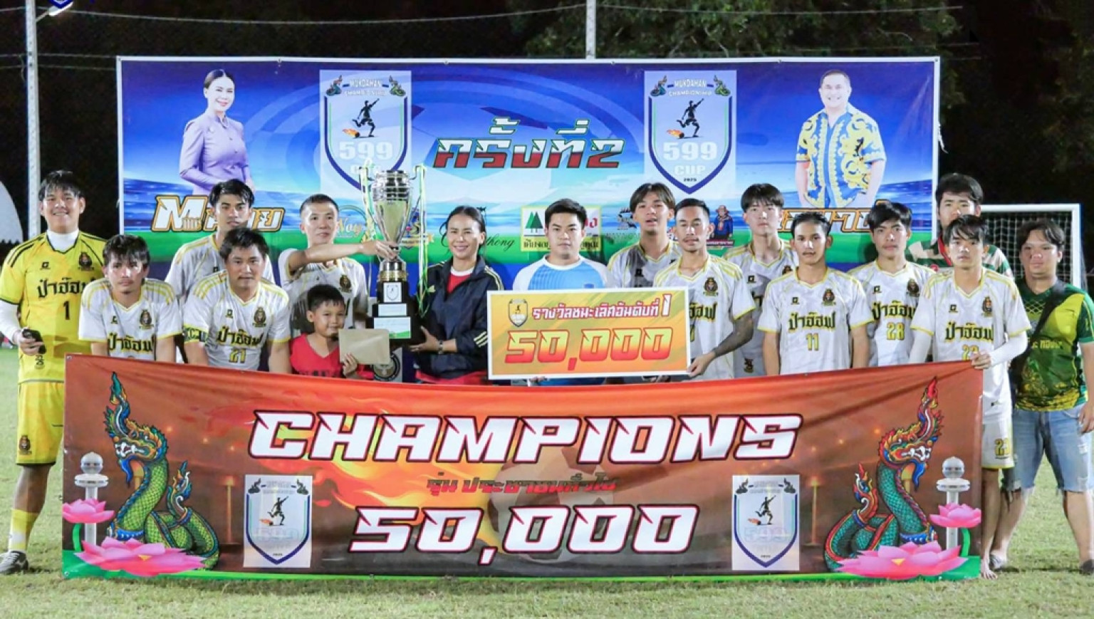ที่สนามเดอบุญฟิลด์ at เฌอเดอบัวมุกดาหาร อำเภอเมือง จังหวัดมุกดาหาร นายไตรสรณคมน์ หนองเรือง (เลขาดำ) อดีตเลขานุการนายกองค์การบริหารส่วนจังหวัดมุกดาหาร พร้อมด้วย นางสาวอรกัญญา สะภา (มาดามน้อย) นายกสมาคมการค้าท่องเที่ยวมุกดาหาร เป็นประธานในการมอบถ้วยรางวัลแก่แชมป์ที่ชนะเลิศในการแข่งขันฟุตบอล 7 คน รุ่นประชาชนทั่วไป รายการ 599 คัพ ครั้งที่ 2 โดยมีทีมฟุตบอลจากทั่วสารทิศสนใจเข้าร่วมการแข่งขันในครั้งนี้จำนวนมาก ซึ่งการแข่งขันเป็นไปด้วยความสนุกสนานและทุกทีมต่างเล่นกันเต็มที่ เพราะที่ผ่านมายังไม่เคยมีการจัดแข่งขันฯ รายการไหนชิงเงินสดจำนวนมากขนาดนี้ โดยแชมป์ในรายการนี้ได้แก่ทีมราชสีห์พาลู เอฟซี ที่เอาชนะ ทีมWAN YAI United ในรอบชิงชนะเลิศ ได้รับเงินสดพร้อมถ้วยรางวัลไปครอง ซึ่งได้แข่งขันในวันที่ 23-24 สิงหาคมที่ผ่านมา