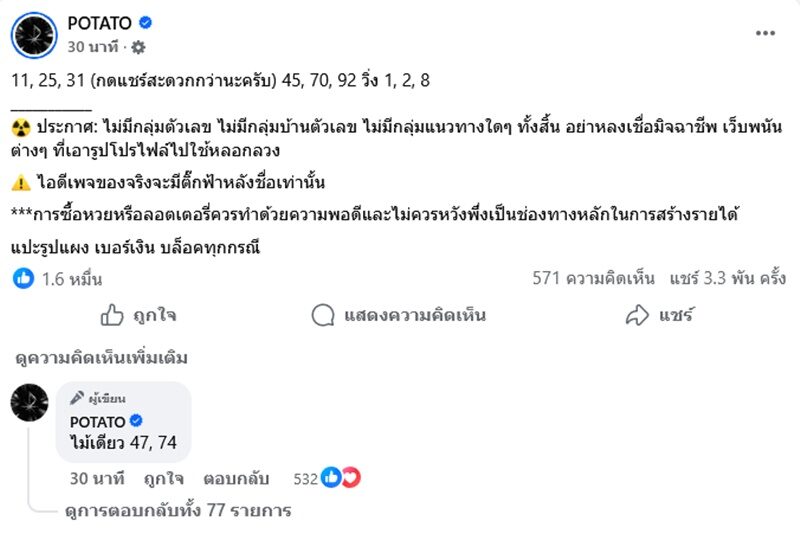 อ่านข่าวต้นฉบับได้ที่ : เลขเด็ด โปเตโต้ จัดให้เต็มๆงวดนี้ ทั้งเลขวิ่ง เลขไม้เดียว แฟนหวยรีบเลย