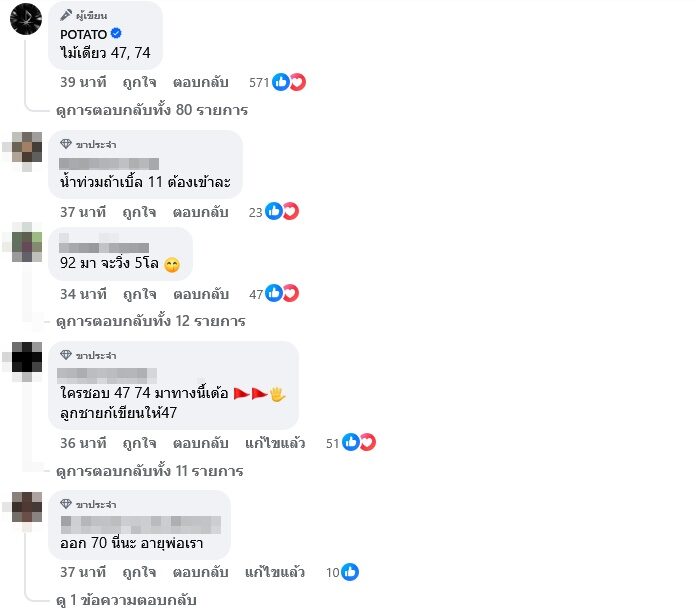 พร้อมทั้งคอมเมนต์เพิ่มเติมให้เลขไม้เดียวด้วยว่า “ไม้เดียว 47, 74” ท่ามกลางแฟนหวยมาคอมเมนต์สนั่นถึงเลขที่ถูกใจและตีเลขกันรัวๆ