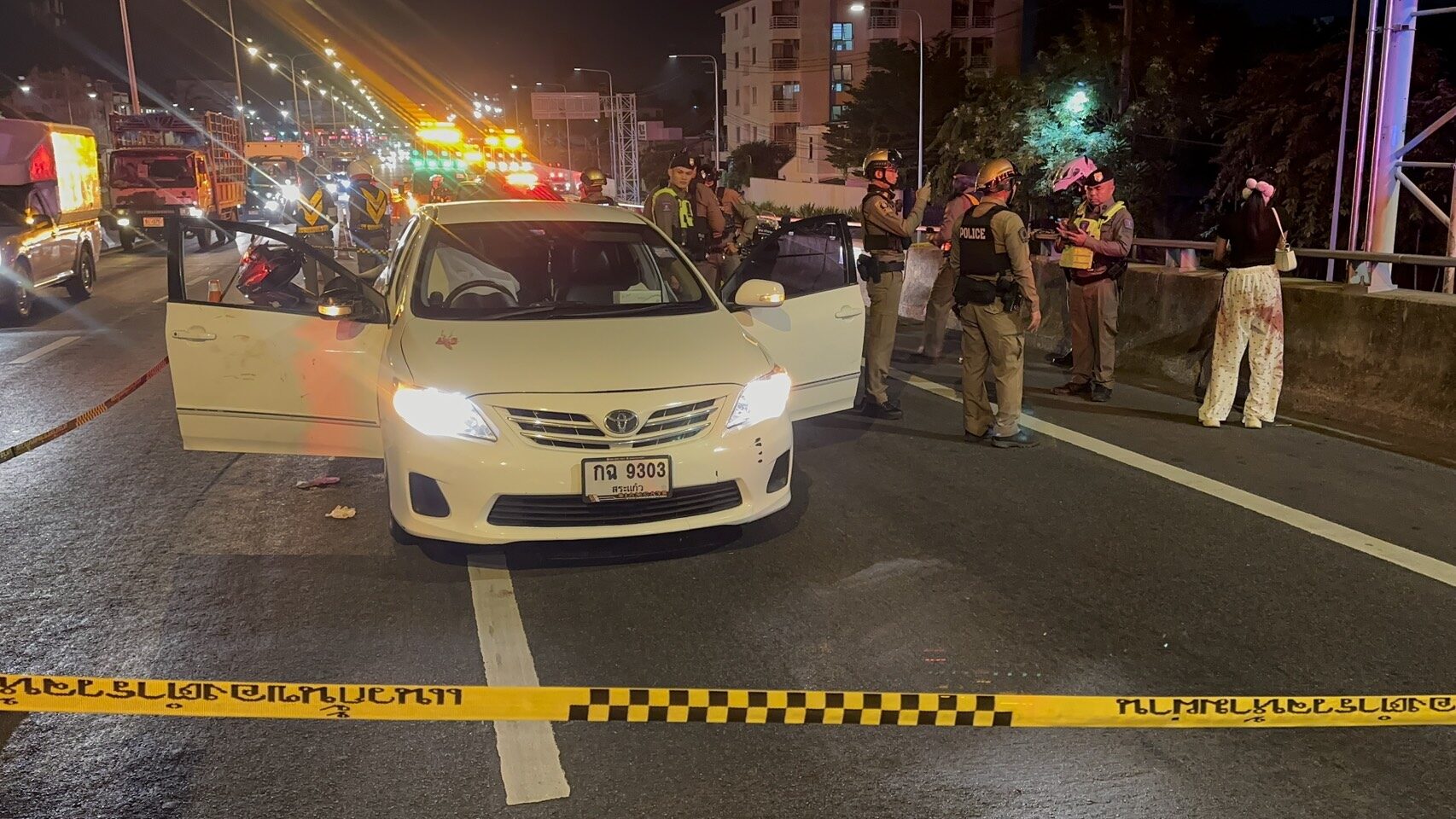 โดยทราบจากพนักงานเก็บค่าทางด่วน ว่าเกิดเหตุรถอัลพาร์ดไล่ยิง รถยนต์โตโยต้าอัลติส หลังจากจ่ายเงินค่าผ่านทาง เป็นระยะทางกว่า 300 เมตร ที่คนร้ายใช้ปืนไล่ยิง เป็นเหตุทำให้คนขับรถโตโยต้าอัลติสเสียชีวิตอยู่บริเวณริมถนนทางด่วน และยังมีกระสุนบางส่วนถูกรถของชาวบ้านที่จอดอยู่ริมรั้วใกล้กับจุดเกิดเหตุได้รับความเสียหาย