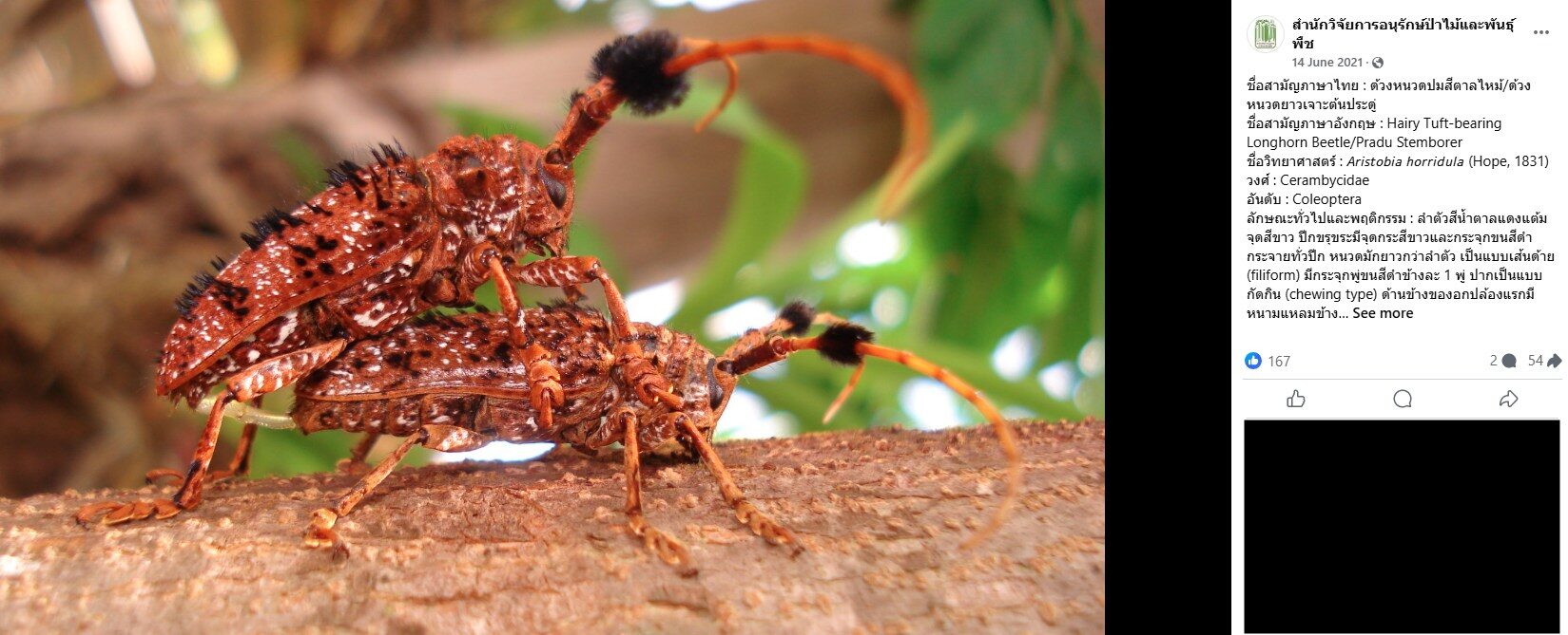 ต่อมามีผู้เข้ามาให้ความรู้ว่า ด้วงหนวดปมสีน้ำตาลไหม้ หรือเรียกแมลงกลุ่มนี้ว่าด้วงหนวดยาว ด้วยลักษณะของหนวดที่ยาวเป็นเอกลักษณ์ จึงเป็นที่มาของชื่อวงศ์ด้วงหนวดยาว Cerambycidae ภาษาอังกฤษเรียก Longhorn Beetle