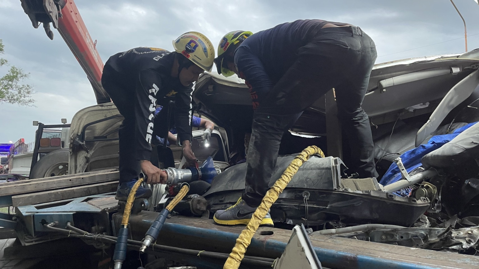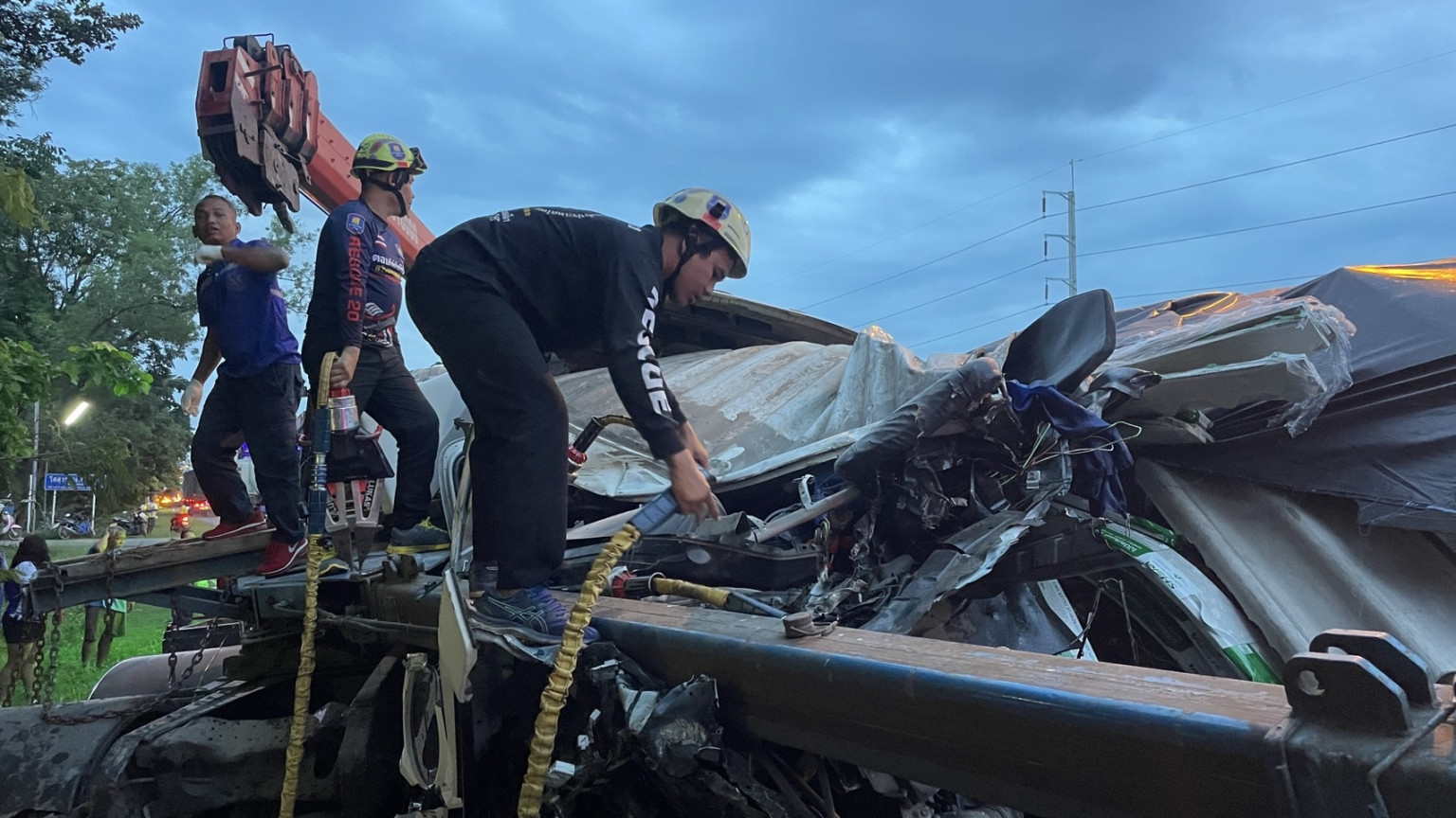 สุรินทร์ วินาศสันตะโร หวิดดับ คนขับรถบรรทุกวูบหลับในพุ่งชนท้ายพ่วง 4 คัน อัดก๊อปปี้ติดภายในยานพาหนะ กู้ภัยเร่งใช้อุปกรณ์ ตัด-ถ่าง เข้าให้การช่วยเหลือ
