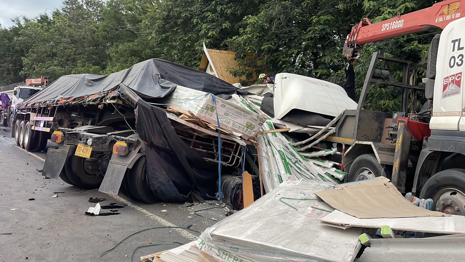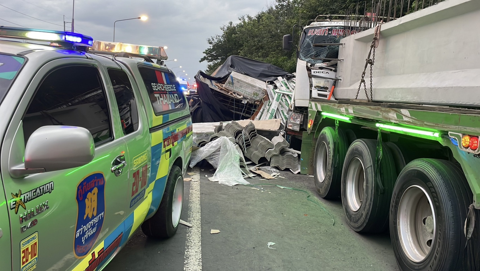 ในที่เกิดเหตุพบรถบรรทุก ยี้ห้อ ISUZU หมายเลขทะเบียน 83-xxxx บุรีรัมย์ ลูกพ่วง 83-xxxx บุรีรัมย์ บรรทุกแท่นปูนสร้างสะพานลอย ทราบชื่อ นายสุมิตร อายุ37.ปี คนขับรถบรรทุก เล่าให้ฟังว่าตนเองและเพื่อนพนักงาน ได้ขับรถบรรทุกแท่นปูนสะพานลอยออกมาจากโรงงานที่ อ.แปลงยาว จ.ระยอง เพื่อนำไปส่งให้ไซต์งานก่อสร้างทางที่ จ.อุบลราชธานี ขณะมาถึงบริเวณจุดเกิดเหตุช่วงกลางดึกตนเองและพนักงานขับรถบรรทุกคันอื่นๆจึงได้แจ้งหยุดรถเพื่อจอดพักบริเวณริมไหล่ทางรุ่งเช้าจะได้ตื่นเพื่อเดินทางต่อ ขณะเวลาช่วงใกล้เช้าจู่ๆ มีรถบรรทุกพ่วง18.ล้อ บรรทุกกระเบื้องมาเต็มคันรถเกิดอาการหลับในเสียหลักพุ่งชนกวาดท้ายรถบรรทุกที่จอดอยู่ริมไหล่ทางทั้งหมด3.คัน ขณะนั้นตนเองนอนพักผ่อนอยู่ภายในรถได้เสียงดังสนั่นหวั่นไหว จึงเรียบลุกขึ้นวิ่งหนีออกจากรถ พบว่ารถของตนถูกชนกวาดลงไปอยู่ข้างทางแล้ว จึงได้โทรสายด่วนประสานขอความช่วยเหลือ