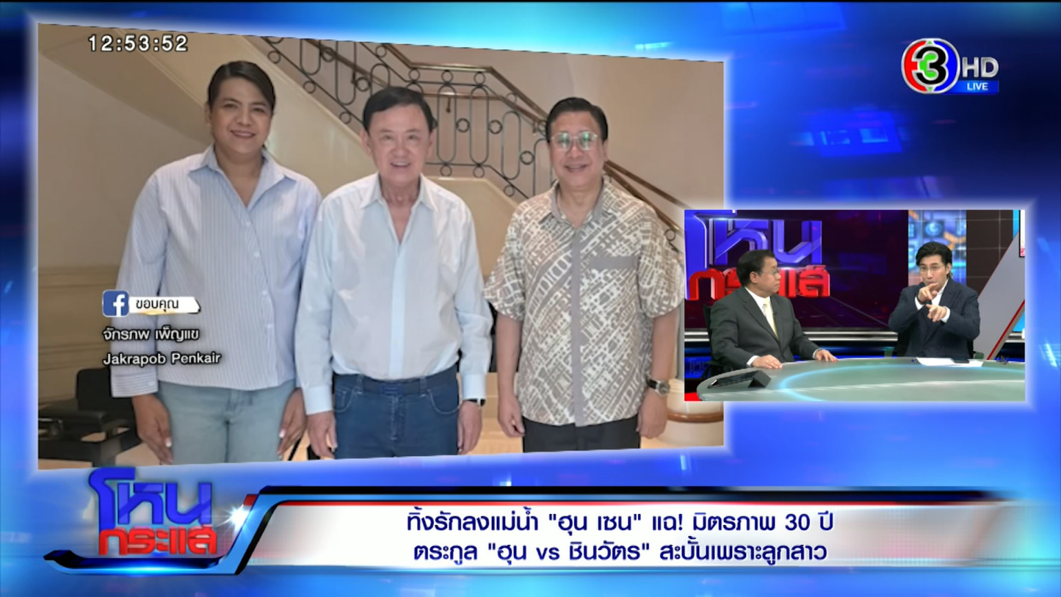 รายการ โหนกระแส วันที่ 27 มิ.ย. ดำเนินรายการโดย“หนุ่ม กรรชัย กำเนิดพลอย” ผลิตในนามบริษัท ดีคืนดีวัน จำกัด ออกอากาศทุกวันจันทร์-ศุกร์ เวลา 12.35 น. ทางช่อง 3 กดหมายเลข 33เกาะติดเหตุการณ์ “สมเด็จฮุนเซน” ประธานวุฒิสภากัมพูชา เปิดโปง “ทักษิณ ชินวัตร” แกล้งป่วยหลายโรค เพื่อหลบเลี่ยงข้อกฎหมาย อุปกรณ์ที่ใส่คอ ใส่มือ ก็แค่การแสดง โดยสัมภาษณ์ จักรภพ เพ็ญแข อดีตรัฐมนตรีประจำสำนักนายกรัฐมนตรี, ผศ.ดร.ปริญญา เทวนฤมิตรกุล อาจารย์ประจำคณะนิติศาสตร์ ม.ธรรมศาสตร์, ดร.ยุทธพร อิสรชัย รองศาสตราจารย์ประจำสาขารัฐศาสตร์ ม.สุโขทัยธรรมาธิราชและ รศ.พ.ต.ท.ดร.กฤษณพงค์ พูตระกูล รองอธิการบดีและประธานกรรมการคณะอาชญาวิทยาฯ ม.รังสิต