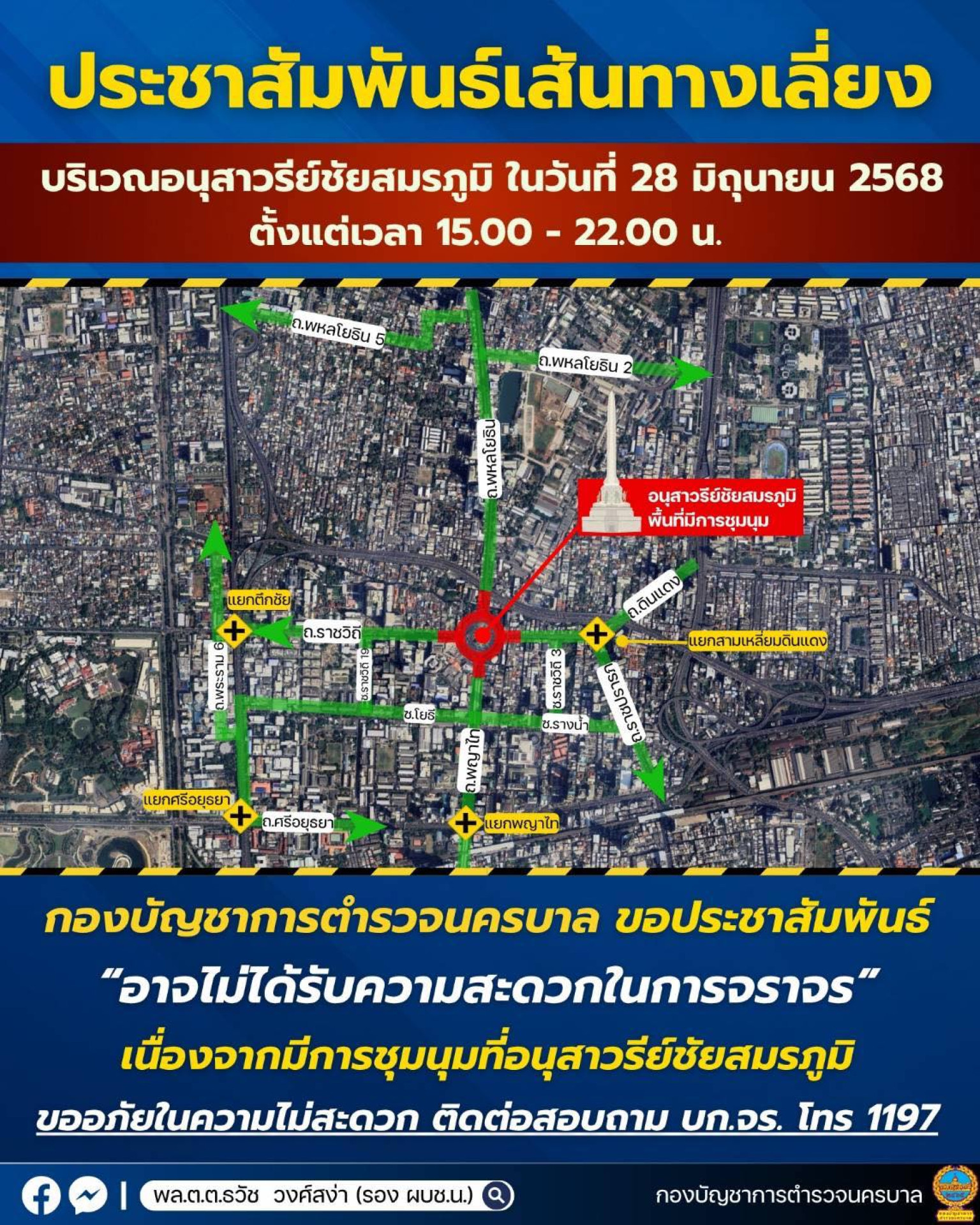 หลีกเลี่ยงเส้นทางบริเวณอนุสาวรีย์ชัยสมรภูมิ 28 มิ.ย.จากการชุมนุม พร้อมเส้นทางแนะนำ
