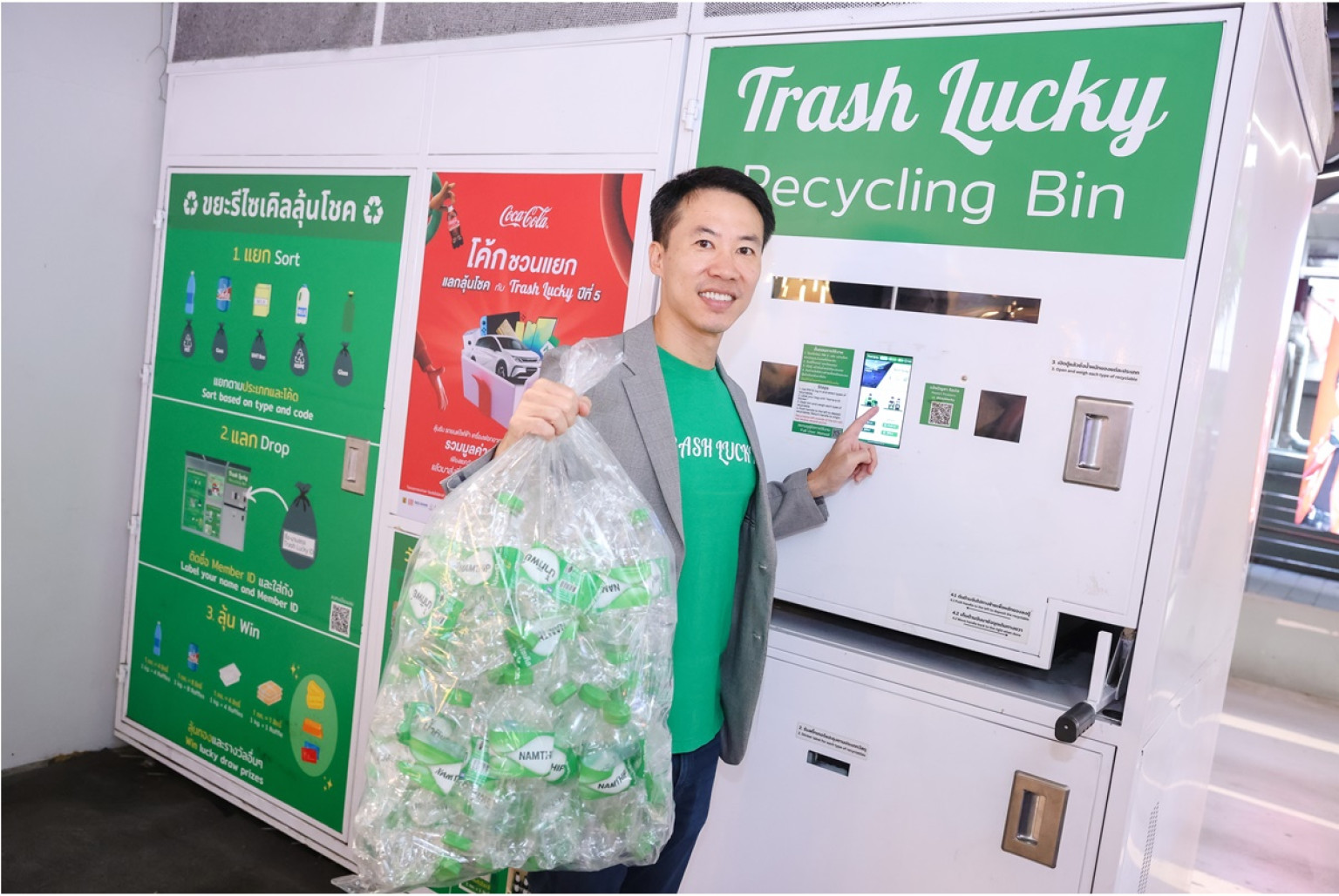 นายณัฐภัค อติชาตการ ผู้ร่วมก่อตั้งและกรรมการผู้จัดการ บริษัท แทรชลัคกี้ จำกัด (Trash Lucky) กล่าวว่า “แทรชลัคกี้มีความยินดีอย่างยิ่งที่โครงการ “ “โค้ก” ชวนแยก แลกลุ้นโชค กับ Trash Lucky” ปีที่ 5 ได้ต้อนรับพันธมิตรใหม่อย่าง ท็อปส์ (TOPS), GO WHOLESALE และมหาวิทยาลัยชั้นนำ 9 แห่ง มาร่วมเป็นจุดรับวัสดุรีไซเคิลแห่งใหม่ ตลอดจนยกระดับความร่วมมือกับ LINE MAN หนึ่งในพันธมิตรผู้สนับสนุนรางวัล ด้วยการมอบโค้ดส่วนลด LINE MAN Food 30% มูลค่าสูงสุด 100 บาท ให้กับทุกคนที่ลงมือรีไซเคิลกับเราในโครงการปีนี้ ซึ่งน่าจะช่วยดึงดูดกลุ่มผู้บริโภครุ่นใหม่ที่ชื่นชอบการแลกรับของรางวัลที่ตอบโจทย์ไลฟ์สไตล์ได้ในทันที นอกจากนี้ แทรชลัคกี้ยังร่วมมือกับมหาวิทยาลัยต่าง ๆ ให้เป็นจุดรับวัสดุรีไซเคิลแห่งใหม่ พร้อมทั้งจัดโรดโชว์และกิจกรรมลุ้นรางวัลตามมหาวิทยาลัยต่าง ๆ อีกด้วย โดยขวดพลาสติก PET ที่เก็บได้ในโครงการ จะถูกนำกลับเข้าสู่ระบบการรีไซเคิลผ่านความร่วมมือกับบริษัท อินโดรามา เวนเจอร์ส จำกัด (มหาชน) ส่วนและกระป๋องอลูมิเนียมจะถูกส่งต่อให้บริษัท ไทยเบเวอร์เรจแคน จำกัด เพื่อนำไปรีไซเคิลในระบบ Closed Loop ซึ่งเป็นระบบที่มีประสิทธิภาพ สามารถลดการใช้ทรัพยากรธรรมชาติ และพลังงานในการผลิตเมื่อเทียบกับการผลิตจากวัตถุดิบใหม่ ถือเป็นระบบรีไซเคิลที่สร้างผลกระทบเชิงบวก และความยั่งยืนในระยะยาว โดยเงินที่ได้จากการรีไซเคิลกระป๋องอลูมิเนียมจะนำไปบริจาคให้กับมูลนิธิขาเทียมในสมเด็จพระ ศรีนครินทราบรมราชชนนี องค์กรที่ผลิตและบริจาคขาเทียมให้กับผู้พิการแขนขาที่ขาดแคลน นับเป็นการสร้างคุณค่าทั้งต่อสิ่งแวดล้อมและสังคมไปพร้อมกัน”