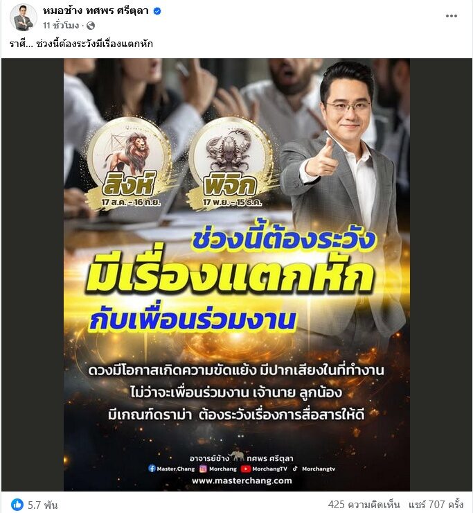 เรื่องงานมีความน่าเป็นห่วงเสียแล้วช่วงนี้ หมอช้าง ทศพร โพสต์เตือน 2 ราศีต้องระวังช่วงนี้ว่า “ราศี… ช่วงนี้ต้องระวังมีเรื่องแตกหัก”