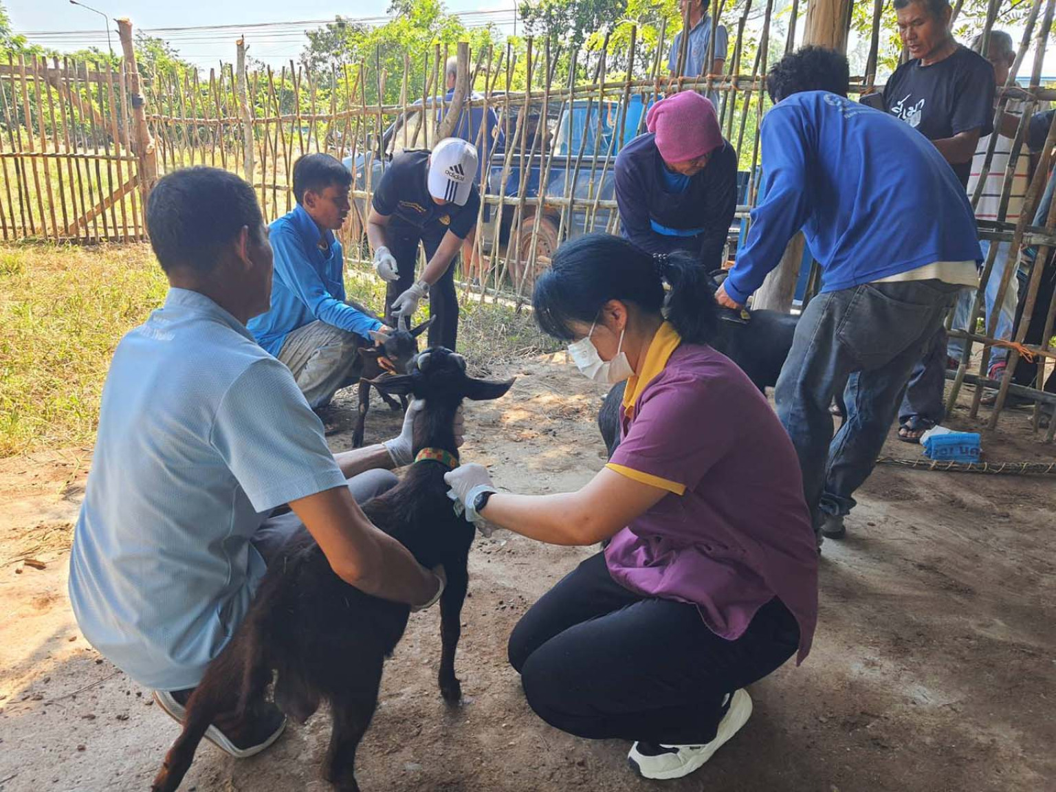 เมื่อวันที่ 19 มิถุนายน 2568 นายสัตวแพทย์ต่อพงศ์ ประเสริฐสังข์ ปศุสัตว์จังหวัดมุกดาหาร มอบหมายให้ นายดนุพล เต็มสิรินันท์ หัวหน้ากลุ่มยุทธศาสตร์และสารสนเทศการปศุสัตว์ และนางสาวมนัธยา แต่ลิบฮง นายสัตวแพทย์ปฏิบัติการ กลุ่มยุทธศาสตร์ฯ ลงพื้นที่ร่วมกับเจ้าหน้าที่สำนักงานปศุสัตว์อำเภอดอนตาล เพื่อดำเนินการฉีดวัคซีนป้องกันโรคปากและเท้าเปื่อย (FMD) และฉีดยาถ่ายพยาธิให้แก่แพะ จำนวน 52 ตัว พร้อมมอบแร่ธาตุก้อนให้แก่เกษตรกรผู้เลี้ยงแพะ จำนวน 26 ราย ซึ่งเป็นกลุ่มทหารผ่านศึกนอกประจำการในตำบลเหล่าหมี อำเภอดอนตาล จังหวัดมุกดาหาร