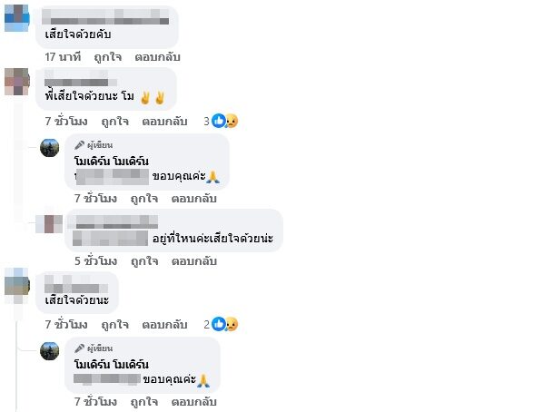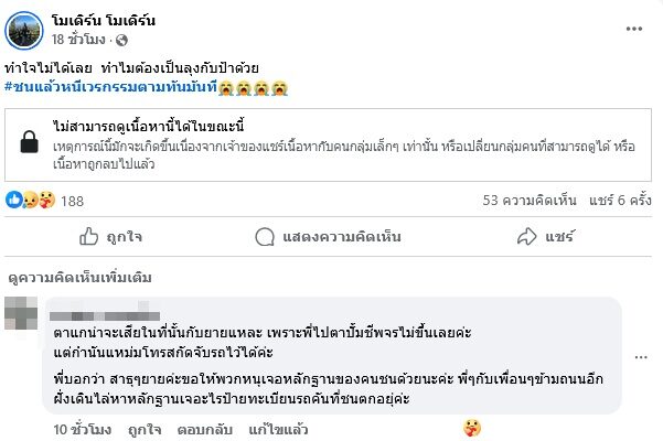 ขณะที่ เฟซบุ๊กชื่อว่า โมเดิร์น โมเดิร์น ซึ่งน่าจะเป็นญาติเป็นหลาน แชร์โพสต์ข่าวช่อง7 แคปชั่นสุดเศร้า และยัง ได้โพสต์ว่า“ทำใจไม่ได้เลย ทำไมต้องเป็นลุงกับป้าด้วย #ชนแล้วหนีเวรกรรมตามทันมันที (อิโมจิร้องไห้หนัก)”