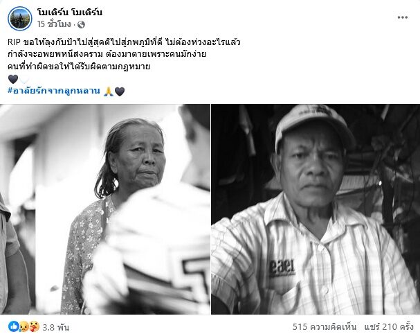 โดยเจ้าของเฟซบุ๊กดังกล่าวยังได้โพสต์อาลัยด้วยว่า “RIP ขอให้ลุงกับป้าไปสู่สุคติไปสู่ภพภูมิที่ดี ไม่ต้องห่วงอะไรแล้ว กำลังจะอพยพหนีสงคราม ต้องมาตายเพราะคนมักง่าย คนที่ทำผิดขอให้ได้รับผิดตามกฏหมาย #อาลัยรักจากลูกหลาน ” โดยมีคอมเมนต์เข้ามาร่วมแสดงความเสียใจจำนวนมาก