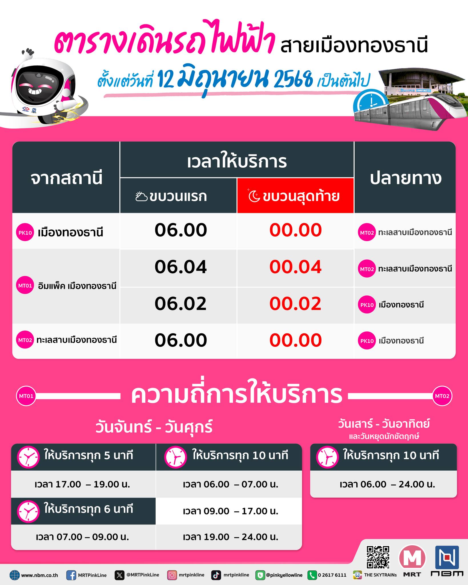 รถไฟฟ้าสายสีชมพู ส่วนต่อขยาย เข้าอิมแพ็ค เมืองทองธานี ขยายเวลาให้บริการเป็น 6 โมงเช้า-เที่ยงคืน พร้อมเพิ่มความถี่ขบวนรถวันทำการช่วงเช้า-ช่วงเย็น ตั้งแต่ 12 มิถุนายน 2568 เป็นต้นไป