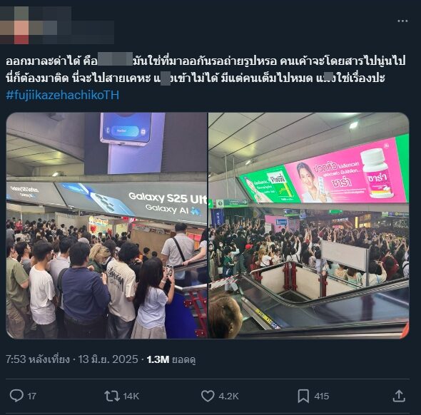 โซเชียลวิจารณ์สนั่น! ไทยมุง คอนเสิร์ตฟรี “ฟูจิอิ คาเสะ” บนสถานีรถไฟฟ้า แน่นจนแออัด ขวางทางเข้า-ออก ทำคนเดินทางสัญจรไม่ได้