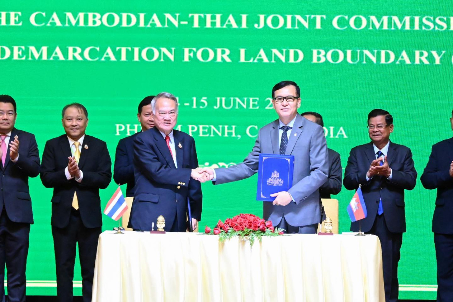 วันที่ 15 มิ.ย.68 เพจ กระทรวงการต่างประเทศ Ministry of Foreign Affairs of the Kingdom of Thailand โพสต์ภาพและข้อความระบุว่า เอกอัครราชทูตประศาสน์ ประศาสน์วินิจฉัย ประธานคณะกรรมาธิการเขตแดนร่วมไทย-กัมพูชา ฝ่ายไทย และนายฬำ เจีย รัฐมนตรีรับผิดชอบกิจการชายแดนและหัวหน้าสำนักงานเลขาธิการกิจการชายแดนแห่งชาติกัมพูชา ประธานร่วมฝ่ายกัมพูชา เป็นประธานร่วมในพิธีปิดการประชุมคณะกรรมาธิการเขตแดนร่วมไทย-กัมพูชา ครั้งที่ 6 (JBC) และลงนามบันทึกการประชุมร่วมกัน ที่กรุงพนมเปญ