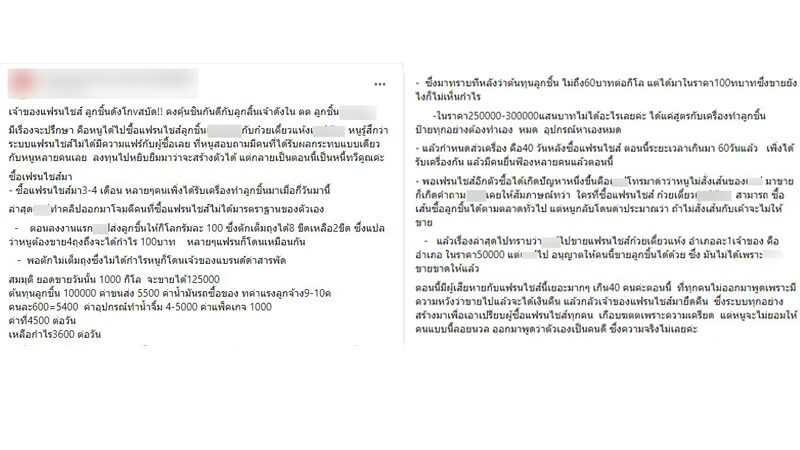 ดราม่า 'แฟรนไชส์ลูกชิ้นร้านดัง' สาวแฉ ระบบแฟรนไชส์ไม่แฟร์-เอาเปรียบผู้ซื้อ อุปกรณ์ส่งช้ากว่ากำหนด ผู้เสียหายจำนวนมาก จ่อฟ้องเพียบ