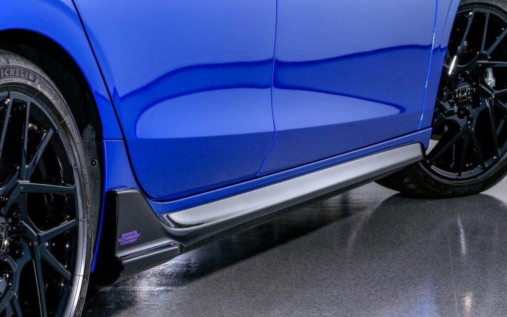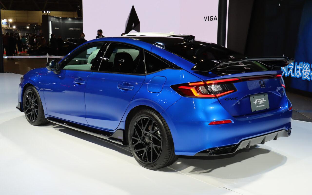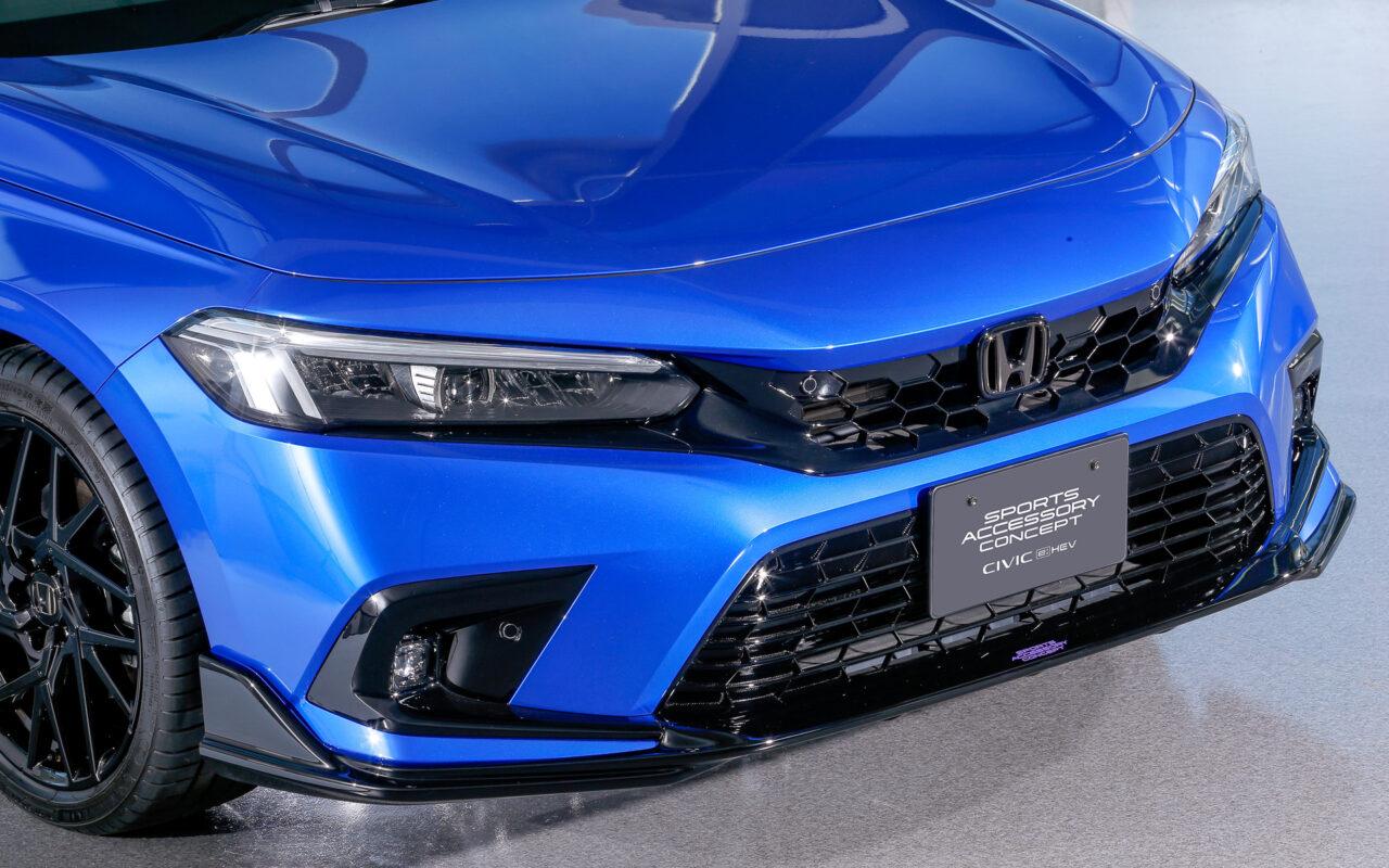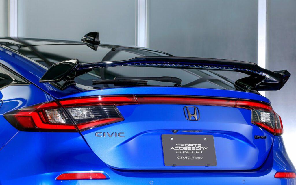 เริ่มกันที่ Honda Civic e:HEV Hatchback Sports Accessory Concept ติดตั้งสเกิร์ตใต้กันชนหน้า สเกิร์ตข้าง และ ลิ้นสปอยเลอร์หลังทั้งหมดที่กล่าวมานี้ตกแต่งสีดำล้วน พร้อมสปอยเลอร์หลังขนาดใหญ่ รวมถึงการตกแต่งสุดเร้าใจเพิ่มทั้งกระจกมองข้างพร้อมไฟเลี้ยว หลังคารถพร้อมเสาอากาศครีบฉลาม ตกแต่งสีดำ และล้ออัลลอยลายเข้ม 18 นิ้วพร้อมยาง 235/40R18 จากค่าย Michelin Pilot Sport และตัวรถสีน้ำเงินทั้งคัน
