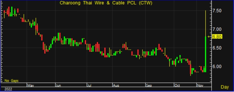 ผู้สื่อข่าวรายงานว่า วันนี้(9 พ.ย.65) ราคาหุ้นบริษัท จรุงไทยไวร์แอนด์เคเบิ้ล จำกัด (มหาชน) หรือ CTW ณ เวลา 15:31 น. อยู่ที่ระดับ 6.80 บาท บวก 0.85 บาท ราคาสูงสุด 7.50 บาท ราคาต่ำสุด 5.85 บาท หรือ 14.29% ด้วยมูลค่าซื้อขาย 238.02 ล้านบาท ราคาหุ้นนิวไฮรอบ 5 เดือน โดยเทียบตั้งแต่หุ้นยืนที่ระดับ 6.90 บาท เมื่อวันที่ 6 มิ.ย.65