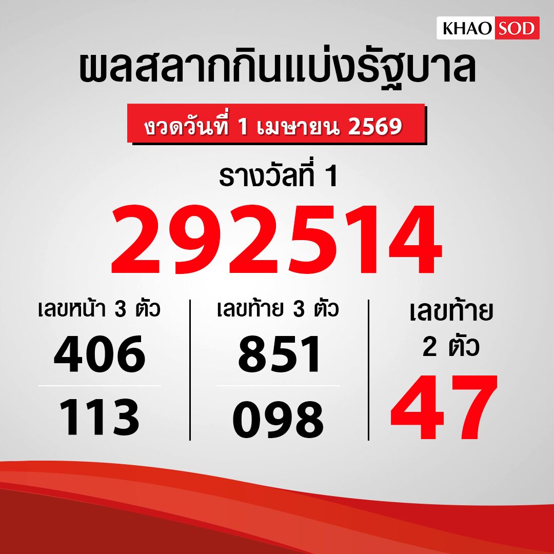 หลังจากสำนักงานสลากกินแบ่งรัฐบาล ออกรางวัลในงวดวันที่ 1 เม.ย.2569 โดยรางวัลเลขหน้า 3 ตัว ออกหมายเลข 406 , 113 รางวัลเลขท้าย 3 ตัว ออกหมายเลข 851 , 098 และรางวัลเลขท้าย 2 ตัวออกหมายเลข 47