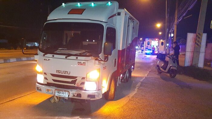 กล้องหน้ารถสลด จยย.พุ่งข้ามเกาะชนยับรถบรรทุก หนุ่มคอหักเสียชีวิต สาวสาหัส