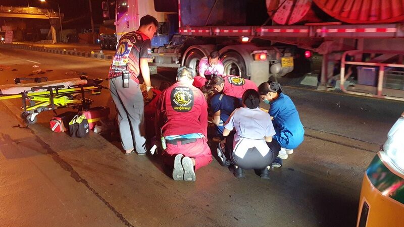 เปิดกล้องหน้ารถสลด จยย.พุ่งข้ามเกาะกลางชนยับรถบรรทุก หนุ่มคอหักเสียชีวิต สาวอาการสาหัส หมวกกันน็อกกระเด็น ตำรวจสอบสวนสาเหตุ