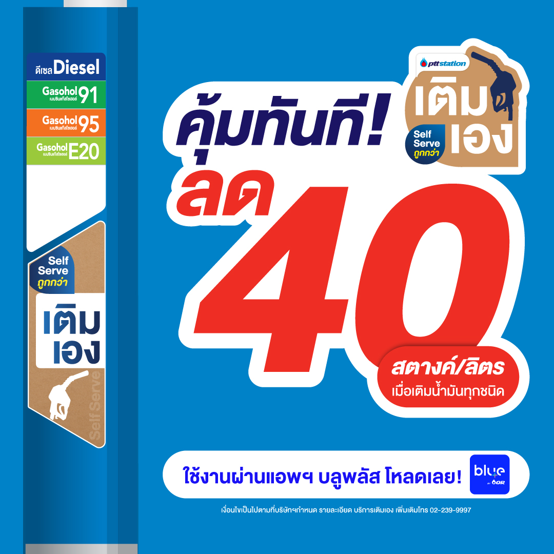 @pttstation.official เติมน้ำมันวันไหนถูกสุด คำตอบ คือ ทุกวัน! แค่มาเติมน้ำมันเอง (Self Serve) ที่พีทีที สเตชั่น เติมเองง่าย จ่ายถูกกว่า ✨ 40 สตางค์/ลิตร ✨ เฉพาะสาขาที่มีบริการ Self Serve ครอบคลุม กว่า 50 สถานี ทั่วกรุงเทพและปริมณฑล สมัครบลูพลัสฟรี! สะสมคะแนนได้ทุกลิตร เช็กสถานี SelfServe ใกล้คุณ เติมเองง่าย ๆ ผ่านแอป Blue Plus โหลดเล้ยย https://blueplusapp.onelink.me/Zvvl/b7rtxnxy เงื่อนไข : 1. ให้ส่วนลดเฉพาะลูกค้าที่ใช้บริการเติมเองผ่านแอปพลิเคชันบลูพลัสเท่านั้น โดยได้รับส่วนลดทันที 40 สตางค์/ลิตร 2. ให้ส่วนลดเมื่อเติมน้ำมัน โดยไม่จำกัดยอดเติมขั้นต่ำ 3. ให้ส่วนลดเฉพาะการทำรายการชำระเงินผ่านบริการเติมเองบนแอปพลิเคชันบลูพลัสเท่านั้น 4. ไม่เข้าร่วมกับการการชำระเงินด้วยเงินสด, เงินโอน และ เงินเชื่อ 5. ไม่เข้าร่วมกับการการชำระด้วย QRCode, PromtPay วิธีการโอนอื่นๆ 6. ไม่เข้าร่วมกับการ Cash Card, Privilege Card และบัตรแทนเงินสดอื่นๆ 7. ไม่เข้าร่วมกับการใช้คูปองส่วนลดน้ำมัน Blueplus+ และคูปองส่วนลดน้ำมันอื่นๆ (หากมี) 8. ไม่เข้าร่วมกับลูกค้า Fleet Card, Fill&Go+, Top up Card TTB และ บัตร บจน. 9. ไม่รองรับการให้ส่วนลดกรณีที่มีการรวบชำระ 10. ไม่รองรับการให้ส่วนลดกรณีที่มีการแบ่งชำระทุกกรณี 11. สมาชิกที่ได้รับส่วนลด จะสามารถสะสมคะแนนบลูพลัสได้ตามปกติ (ยอดสะสมหลังหักส่วนลด) 12. ไม่เข้าร่วมกับกิจกรรมแจกน้ำดื่ม 13. ไม่เข้าร่วมกับโปรรถใหญ่กรอกถัง 14. ไม่เข้าร่วมกับโปรโมชันอื่นๆ เว้นแต่มีระบุไว้ในเงื่อนไขของโปรโมชั่นนั้น *เฉพาะสาขาที่มีบริการเติมเอง (Self Serve) **หากพบปัญหาในการใช้งาน ติดต่อ 02-239-9997 #พีทีทีสเตชั่น #PTTStation #ปั๊มปตท #ชีวิตติดสมูท #เติมน้ำมันเอง #เติมเองถูกกว่า #SelfServe ♬ original sound – PTT Station