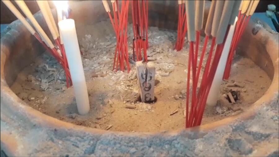 จากนั้นเจ้าของตลาดจึงไปนำมะพร้าวน้ำหอมมาถวาย ก่อนที่ร่างทรงจะได้ชูนิ้วมือเป็นสัญลักษณ์คล้ายการใบ้เลขเป็นภาษามือ โดยครั้งแรกได้ ชู 1 นิ้ว ครั้งที่สองชู 8 นิ้ว และครั้งสุดท้ายชู 3 นิ้ว ชาวบ้านจึงนำไปตีเป็นเลขเด็ดในงวดนี้คือ 183 นอกจากนี้ยังพากันจุดธูปจีนเสี่ยงทายตัวเลข ได้หมายเลข 698 จึงพากันนำไปซื้อล็อตเตอรี่เสี่ยงโชคในงวดนี้กันตามระเบียบอีกด้วย
