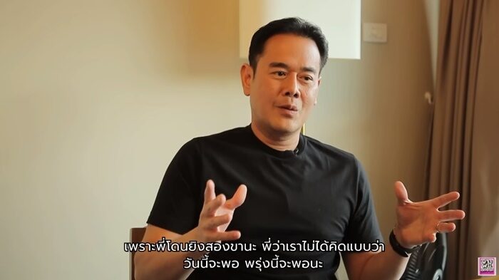 ตอนไหนที่คิดว่าพอดีกว่า เป๊ก เผยว่า ตอนโดนยิงก็สาหัสสากรรจ์นะ 6 เดือนพี่เดินไม่ได้เลย พี่โดนยิง 2 ขาเลย เราไม่ได้คิดว่าวันนี้ พรุ่งนี้จะพอ ด้วยเวลาอายุเราโต เราแก่ขึ้น แบบเป็นไปเองเดี๋ยวนี้เด็กสมัยใหม่ เรามันเก่าไปเลย เราเอาต์แล้ว มันไม่รู้จักเราไง เดี๋ยวนี้ไปชนไหล่ ครับผม ขอโทษครับ เดินหลบ