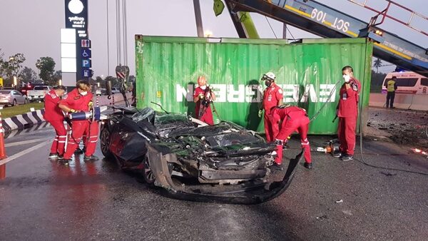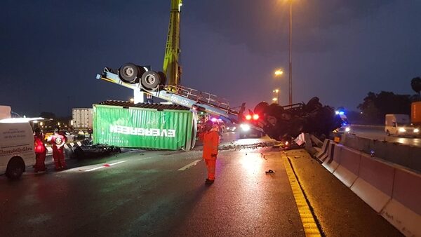 ที่เกิดเหตุพบรถพ่วง 18 ล้อ บรรทุกตู้คอนเทนเนอร์ ยี่ห้ออีซูซุ ทะเบียนส่วนหัว 61-1837 กทม. ส่วนหางพ่วง 77-0931 กทม. สภาพพลิกคว่ำหงายท้องล้อชี้ฟ้า ส่วนหางขวางกลางถนน ส่วนตู้คอนเทนเนอร์ทับรถเก๋ง ยี่ห้อฮอนด้า ซีวิค ทะเบียน 5กอ2419 กรุงเทพฯ สภาพแบนเป็นเศษเหล็ก