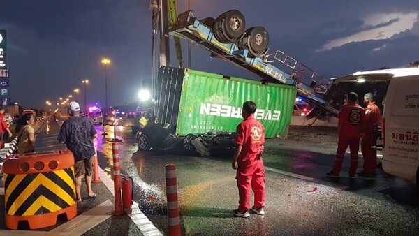 พ่วง18ล้อ เบรกไม่อยู่พลิกคว่ำ ตู้คอนเทนเนอร์ทับเก๋งแบนติดพื้น สาวดับสลด