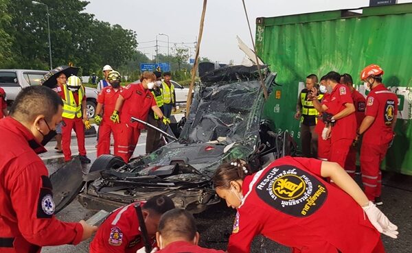 พ่วง18ล้อ บรรทุกตู้คอนเทนเนอร์ พลิกคว่ำทับเก๋งแบนติดพื้น สาววัย 34 ปี เสียชีวิตสลด