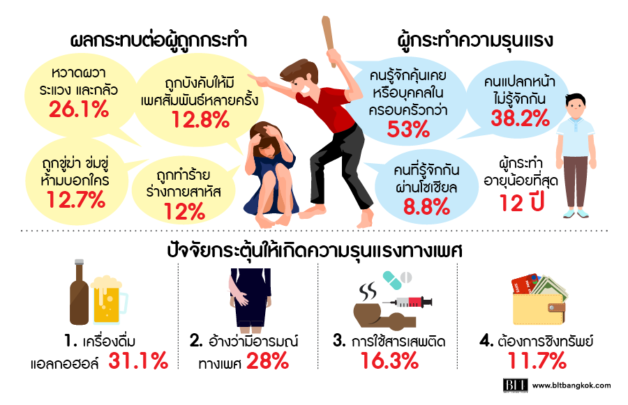 - กลุ่มเด็กและเยาวชนอายุระหว่าง 5-20 ปี ถูกกระทำเยอะที่สุด คิดเป็น 60 เปอร์เซ็น และอาชีพที่ถูกกระทำเยอะที่สุด คือ นักเรียนและนักศึกษา คิดเป็น 60 เปอร์เซ็น พูดง่ายๆก็คือ ในนักเรียน 100 คน จะมี 60 คนที่เคยโดนละเมิดทางเพศ