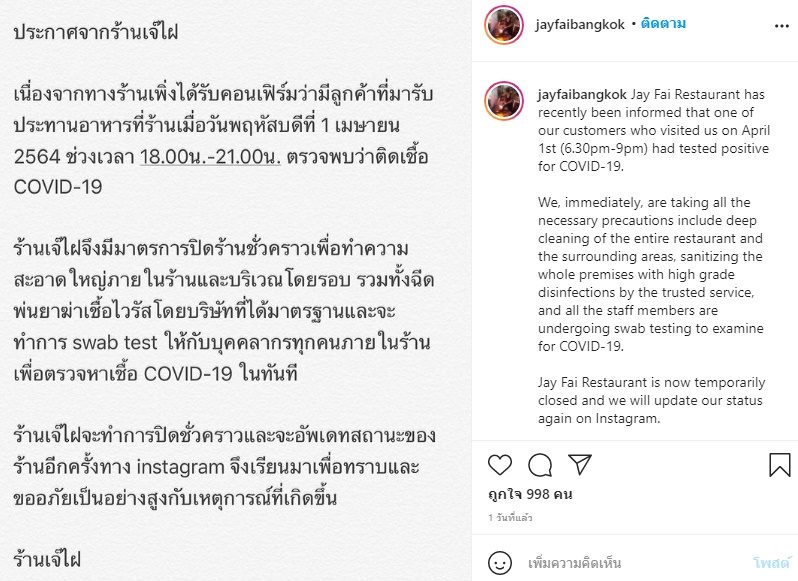 วันที่ 5 เม.ย.64 จากกรณีนายคาซึยะ นาชิดะ เอกอัครราชทูตวิสามัญผู้มีอำนาจเต็มแห่งญี่ปุ่นประจำประเทศไทย ติดเชื้อโควิด-19 และต่อมาร้านอาหารสตรีทฟู้ดชื่อดังระดับมิชลินสตาร์ ‘เจ๊ไฝ’ ได้แจ้งปิดร้านชั่วคราว เนื่องจากพบผู้ป่วยโควิด-19 มารับประทานอาหารที่ร้าน เมื่อวันที่ 1 เม.ย.ที่ผ่านมา