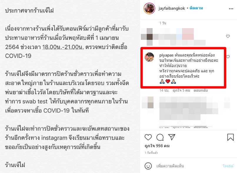 โดย ‘เจ๊ไฝ’ ได้โพสต์ข้อความในไอจีของร้านแจ้งไปยังลูกค้าให้ทราบถึงรายละเอียด ก่อนม.ล.ปิยาภัสร์ ภิรมย์ภักดี หรือคุณหญิงต้น ไฮโซคนดัง ผู้รับบท สุริโยไท และเป็นมารดาของ “ตั๊น”-จิตภัสร์ กฤดากร เข้ามาแสดงความเห็นที่โพสต์ของร้านเจ๊ไฝว่า