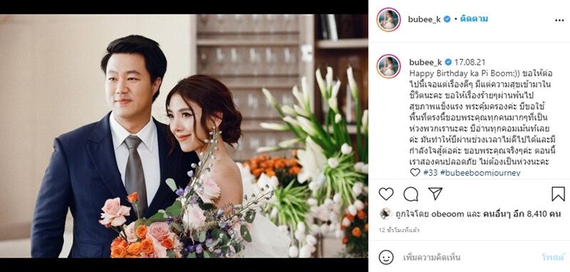 ล่าสุด ไฮโซบูบี โพสต์ภาพกับแฟนหนุ่ม พร้อมอวยพรวันเกิดหลังเจอเหตุการณ์รถชนด้วยว่า 17.08.21 Happy Birthday ka Pi Boom:)) ขอให้ต่อไปนี้เจอแต่เรื่องดีๆ มีแต่ความสุขเข้ามาในชีวิตนะคะ ขอให้เรื่องร้ายๆผ่านพ้นไป สุขภาพแข็งแรง พระคุ้มครองค่ะ