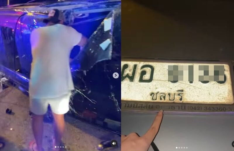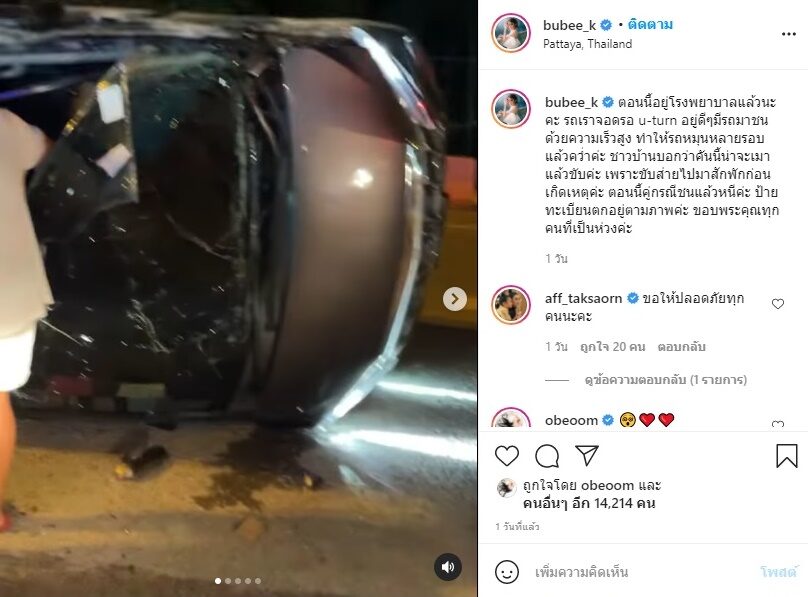 โดยเจ้าตัวโพสต์คลิปป้ายทะเบียนคู่กรณีที่ทิ้งไว้ในที่เกิดเหตุ พร้อมทั้งบอกว่า ตอนนี้อยู่โรงพยาบาลแล้วนะคะ รถเราจอดรอ u-turn อยู่ดีๆมีรถมาชนด้วยความเร็วสูง ทำให้รถหมุนหลายรอบแล้วคว่ำค่ะ ชาวบ้านบอกว่าคันนี้น่าจะเมาแล้วขับค่ะ เพราะขับส่ายไปมาสักพักก่อนเกิดเหตุค่ะ ตอนนี้คู่กรณีชนแล้วหนีค่ะ ป้ายทะเบียนตกอยู่ตามภาพค่ะ ขอบพระคุณทุกคนที่เป็นห่วงค่ะ