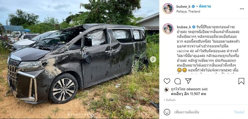 ก่อนจะโพสต์อีกในวันต่อมาสภาพรถพังยับ พร้อมบอกว่า วันนี้บีรีบมาดูรถก่อนเค้าจะย้ายค่ะ รถคู่กรณีเปิดมากลิ่นเหล้าหึ่งเลยค่ะ กลิ่นชัดมากๆ หลังกระบะมีขวดเบียร์เยอะมาก ตอนนี้คนขับหนีค่ะ ไม่ยอมมาแสดงตัว บอกตำรวจว่าเค้าเข้ากรุงเทพไปฉีด vaccine ค่ะ เค้าไม่รับผิดชอบเลย ตำรวจก็ไม่มานี่บีมาดูเองค่ะ กลัวของจะถูกเก็บหรือย้ายค่ะ หลักฐานชัดมากๆ ประกันและทุกคนเป็นพยานได้เลยว่ากลิ่นเหล้าหึ่งจริงๆ ตอนนี้กำลังไปแจ้งความนะคะ เมื่อคืนตำรวจไม่รับเรื่องบอก”เรื่องนี้ไม่ใช่เรื่องสำคัญ” ให้กลับไป พรุ่งนี้ค่อยว่ากันค่ะ #justiceforbb