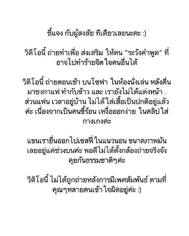 พร้อมกับนี้ นักแสดงสาวยังได้เขียนชี้แจงเป็นภาพข้อความว่า ชี้แจงกับผู้สงสัยทีเดียวเลยนะคะ วิดิโอนี้ถ่ายทำเพื่อส่งเสริมให้คนระวังคำพูดที่อาจทำร้ายจิตใจคนอื่นได้